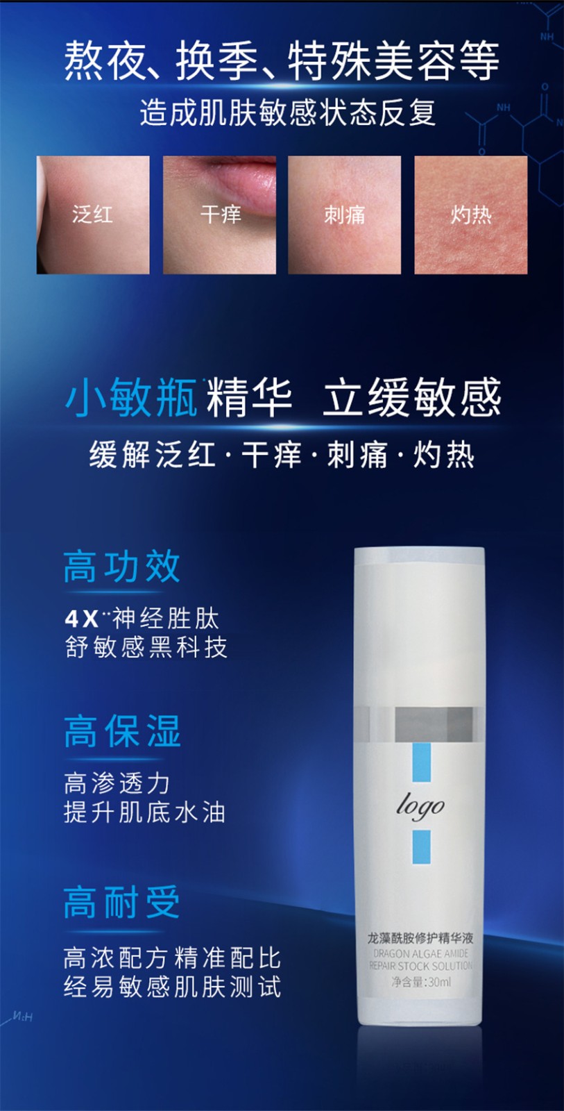 【产品名称】:舒缓修护精华(您的品牌)